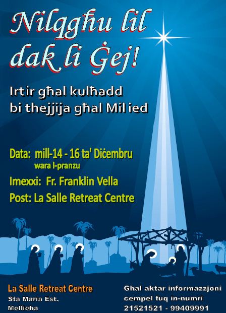 Irtir bi tħejjija għal Milied 2012 Irtir għal kulħadd bi tħejjija għal Milied fil-La Salle Retreat Centre, Mellieħa. Imexxi Fr Fraklin Vella. Mill-Ġimgħa, 14 sal-Ħadd, 16 ta’ Diċembru. |