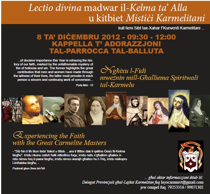 Ngħixu l-Fidi mweżnin mill-Għalliema Spiritwali Kull tieni Sibt tax-xahar, bejn id-9.30 ta’ filgħodu u nofsinhar, f’xi wieħed mill-Kunventi Karmelitan, kif jidher fil-programm. Ara l-poster b'aktar dettalji ...>