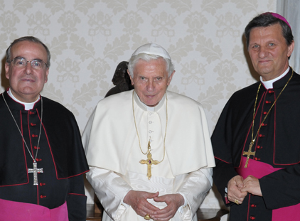 Vatikan, Tnejn 28 ta’ Mejju 2012: Il-qofol taż-żjara Ad Limina li l-Arċisqof ta’ Malta, Monsinjur Pawlu Cremona OP u l-Isqof ta’ Għawdex, Monsinjur Mario Grech kellhom f’Ruma, kien illum, meta ltaqgħu privatament mal-Papa Benedittu XVI. Huwa ftakar fiż-żjara tiegħu f’Malta u l-laqgħa sabiħa li kellu mill-poplu Malti. Fost id-diversi temi diskussi, il-Qdusija Tiegħu tkellem dwar il-familja u l-bżonn li t-tfal jitrawwmu fil-fidi sabiex b’hekk il-fidi terġa’ tidħol fil-familja. Tkellem ukoll dwar il-vokazzjonijiet u kellu kliem ta’ apprezzament għall-ħidma li jwettqu s-saċerdoti Malti kemm f’pajjiżna u kif ukoll f’artijiet tal-missjoni. |