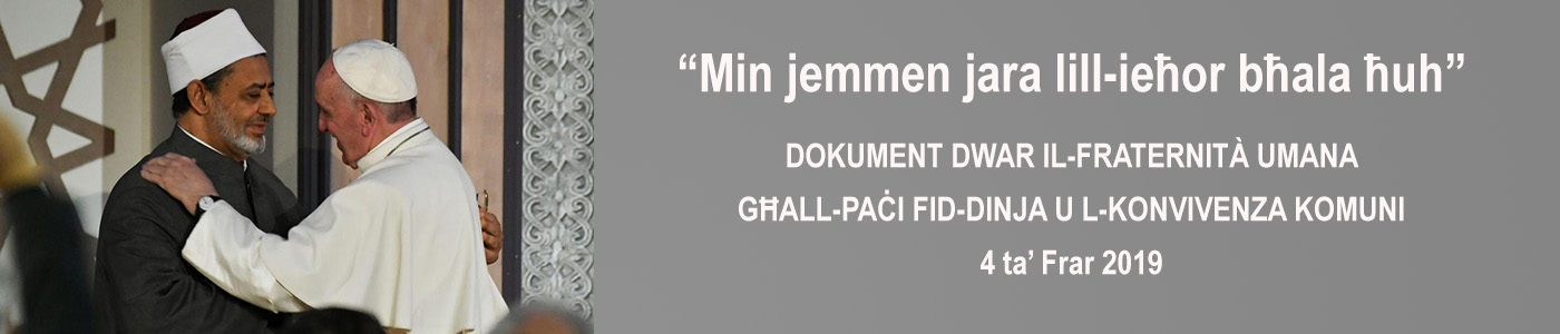 Minn dawn id-dibattiti fraterni u sinċieri li kellna, u mil-laqgħa mimlija tama f’futur imdawwal għall-bnedmin kollha, nibtet l-idea ta’ dan id-Dokument dwar il-Fraternità Umana. Dokument irraġunat bis-sinċerità u s-serjetà biex ikun dikjarazzjoni komuni ta’ rieda tajba u leali, sabiex jistieden lill-bnedmin kollha li jġorru fihom il-fidi f’Alla u l-fidi fil- umana jingħaqdu u jaħdmu flimkien, ħalli dan isir gwida għall-ġenerazzjonijiet il-ġodda lejn kultura ta’ rispett reċiproku, u jinftiehem bħala grazzja kbira divina li tagħmel lill-bnedmin kollha aħwa.