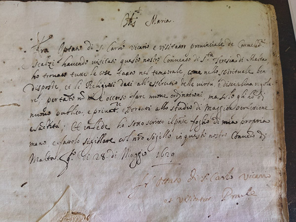 Referenza: Catalogo: Archivio dell'Ordine dei Carmelitani Scalzi – OCD Citta` Cospiqua Malta Sezione: Convento C 7 Libro della SS Visite Generalizie AD 1627 – 1959. IL CARMELO IN SICILIA https://www.carmelodisicilia.it/il-carmelo-in-sicilia (notament fl- 24 ta` Settembru 2021)