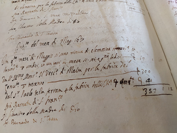 L-ispejjeż għall-bini tal-Kunvent u l-Knisja kienu jiġu miflija mill-Visitator Generale li kultant żmien kien jiġi Malta sabiex jara li kollox kien miexi skont il-Kostituzzjoni u drawwiet Tereżjana għall-ġid spiritwali tal-Ordni. Fit-13 ta` Ottubru 1635 Patri Serafino di St Maria Provinċjal ta` San Albert Sqallija ħa nota tad-dħul u ħrug minn żmien l-aħħar laqgħa ta` Patri Alesio di San Angelo jiġifieri mis-16 ta` Ottubru 1633 sa Ottubru 1635 u sab li l-kunvent kien ġabar sudi 1529 tari ` 6 u grani 4 u ħallas skudi 2270 tari` 11 u grani 11 biex ħareġ minn taħt b` 741 skud u 7 grani. Fil-fatt ġie nnutat li l-bilanċ kien ta` 350 skud hekk kif dħul ta` 390 skud ma ġiex innutat qabel ma tħallas. B`hekk il-viżitatur tal-Ordni Tereżjan ħeġġeġ lill-Patrijiet li kull ammont miġbur jitpoġġa ġewwa il-Cassa u jgħaddi mill-ewwel għand il-Prokuratur.