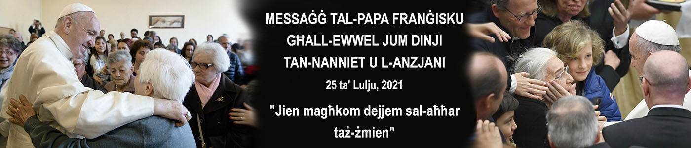 "Jien magħkom dejjem sal-aħħar taż-żmien" (cfr Mt 28,20) hi l-wegħda li għamel il-Mulej lid-dixxipli qabel ma tela' s-sema u li llum itennieha lilek, għażiż nannu, għażiża nanna. Lilek. "Jien magħkom dejjem sal-aħħar taż-żmien" huwa wkoll kliem li bħala Isqof ta' Ruma u anzjan bħalek nixtieq ngħidlek fl-okkażjoni ta' dan l-Ewwel Jum Dinji tan-Nanniet u l-Anzjani: il-Knisja kollha hi qribek - biex ngħiduha aħjar, tinsab qribna; tieħu ħsiebek, tixtieqlek il-ġid u ma tridx tħallik waħdek!